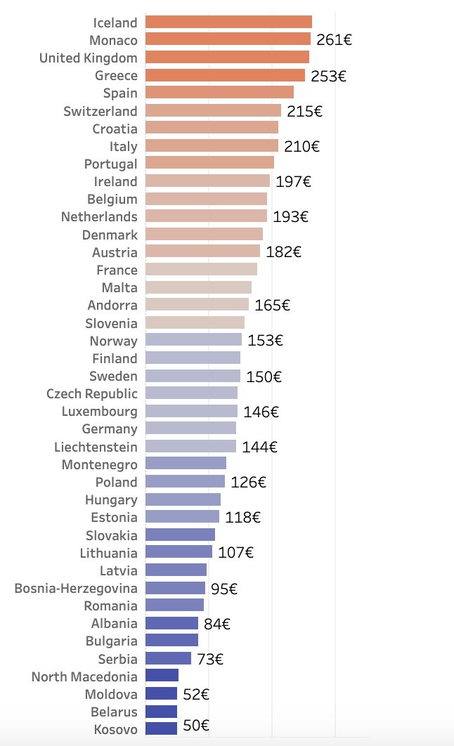 Πρώτη όσον αφορά τη μέση τιμή φέτος το καλοκαίρι είναι η Ισλανδία με 264 ευρώ, με 261 ευρώ ακολουθεί το Μονακό και 260 ευρώ το Ηνωμένο Βασίλειο. Η Ισπανία, ο κορυφαίος ευρωπαϊκός προορισμός στη Μεσόγειο συμπληρώνει το τοπ 5, στην πέμπτη θέση μετά την Ελλάδα με 236 ευρώ. Κόσοβο, Λευκορωσία και Μολδαβία είναι οι τρεις φθηνότερες χώρες με τιμές από 50 έως 52 ευρώ. Κατά μέσο όρο φέτος στην Ευρώπη, οι τιμές ανά δωμάτιο «τρέχουν» με άνοδο κατά 9% σε σχέση με πέρυσι, με την Ελλάδα, παρά το γεγονός ότι περιλαμβάνεται στις 5 ακριβότερες αγορές να σημειώνει οριακή αύξηση στο +1%.