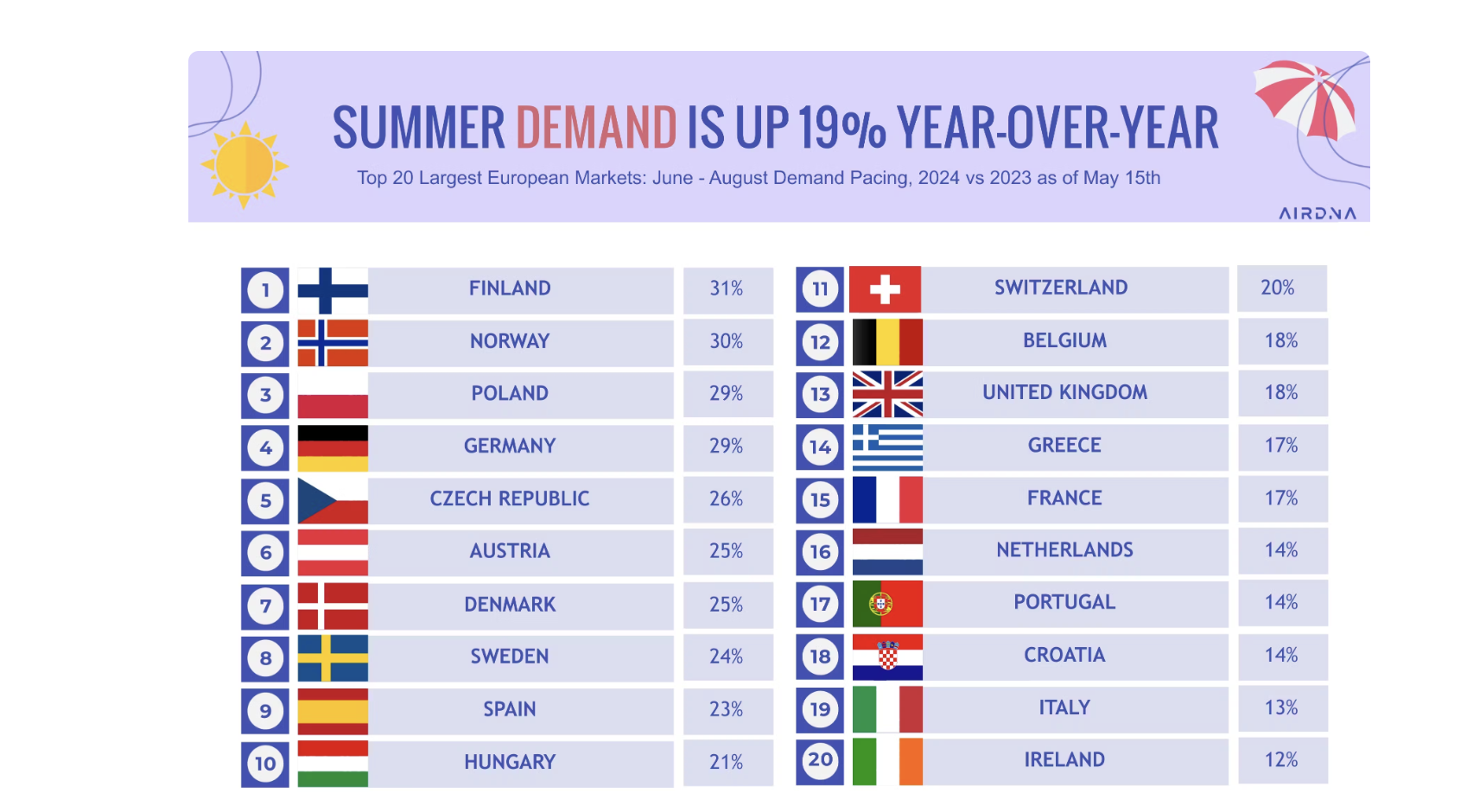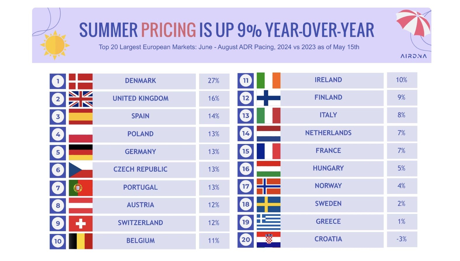 Ειδικότερα, με βάση τα στοιχεία από την AirDNA, τη γνωστή εταιρεία αναλύσεων δεδομένων βραχυχρόνιας μίσθωσης με στοιχεία από τις πλατφόρμες των Airbnb και VRBO, για τη «θερμή» περίοδο Ιουνίου- Αυγούστου η χώρα μας βρίσκεται στο τοπ 5 των ακριβότερων αγορών, με μία μέση τιμή στα 253 ευρώ. Τα στοιχεία έχουν εξαχθεί με βάση την ημερομηνία στις 15 Μαΐου για κρατήσεις το καλοκαίρι και όπως προκύπτει η, αύξηση της ζήτησης σε όλη την Ευρώπη για τον Ιούνιο και τον Ιούλιο είναι στο +17% και για τον Αύγουστο στο +22%, με τους ρυθμούς στη χώρα μας να είναι κι αυτοί σε διψήφια ποσοστά, ωστόσο ελαφρώς χαμηλότερα σε σύγκριση με τον ευρωπαϊκό μέσό όρο.