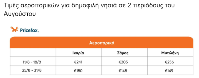 Αν, δηλαδή, θέλεις να ταξιδέψει την Παρασκευή πριν το δεκαπενταύγουστο στις 11 του Αυγούστου σε δημοφιλείς προορισμούς όπως είναι η Ικαρία, η Σάμος και η Μυτιλήνη, και να γυρίσεις την επόμενη Παρασκευή στις 18 Αυγούστου (δηλαδή να πας ολόκληρη τη βδομάδα διακοπές) τότε θα πληρώσεις πάνω από 200€ για τα αεροπορικά εισιτήρια (με επιστροφή).