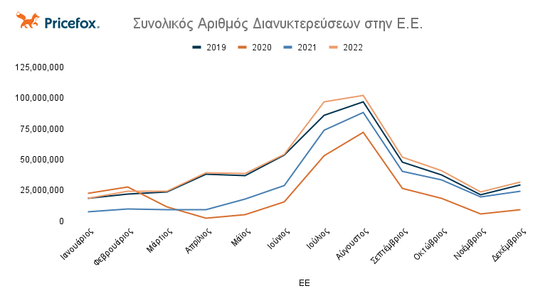Οι υψηλότερες τιμές διανυκτερεύσεων καταγράφονται τους καλοκαιρινούς μήνες, ιδιαίτερα τον Ιούλιο και Αύγουστο, με το 2022 να φτάνει τις 96,752,338 και 102,328,421 διανυκτερεύσεις αντίστοιχα. Ενώ οι αντίστοιχοι μήνες το 2019 κατέγραψαν 85,759,459 και 96,922,990, δηλαδή 31% και 16% αύξηση αντίστοιχα.
