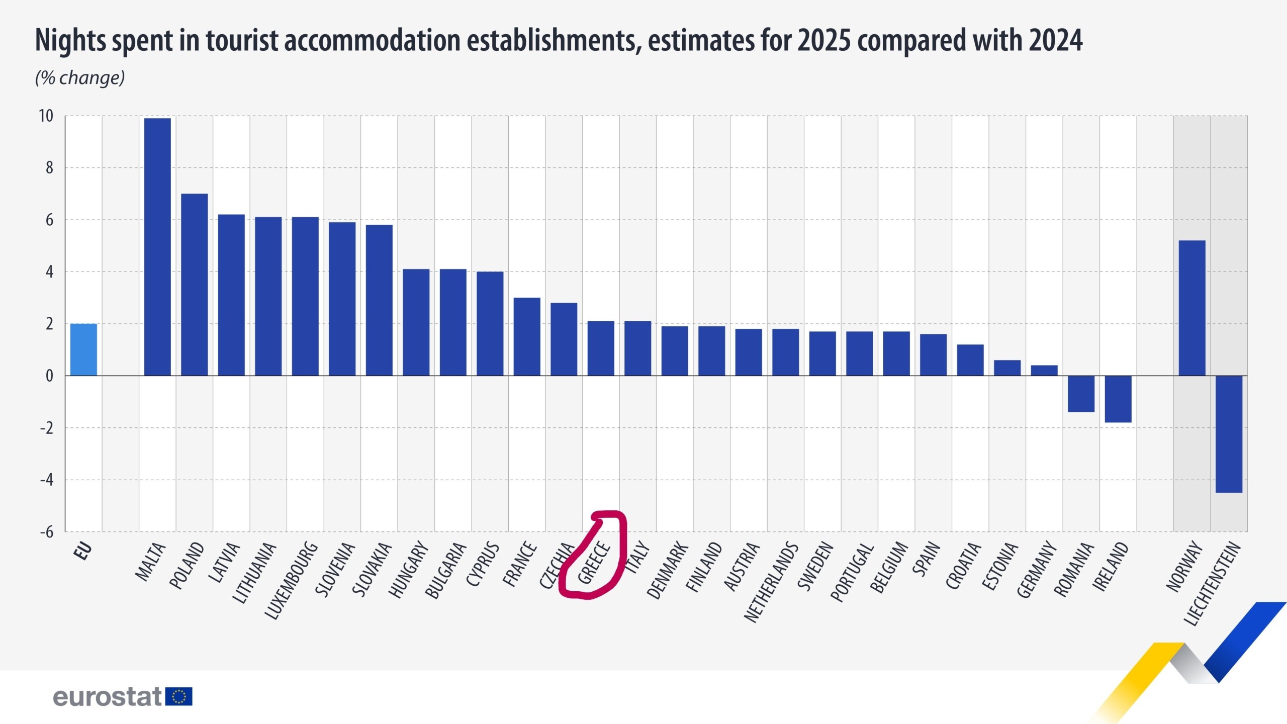 Σε σύγκριση με το 2024, ο αριθμός των διανυκτερεύσεων αυξήθηκε σχεδόν σε όλες τις χώρες της ΕΕ το 2025. Τη μεγαλύτερη άνοδο κατέγραψαν η Μάλτα (+10%), η Πολωνία (+7%) και η Λετονία (+6%). Αντίθετα, μικρές μειώσεις σημειώθηκαν στη Ρουμανία (-1%) και την Ιρλανδία (-2%).