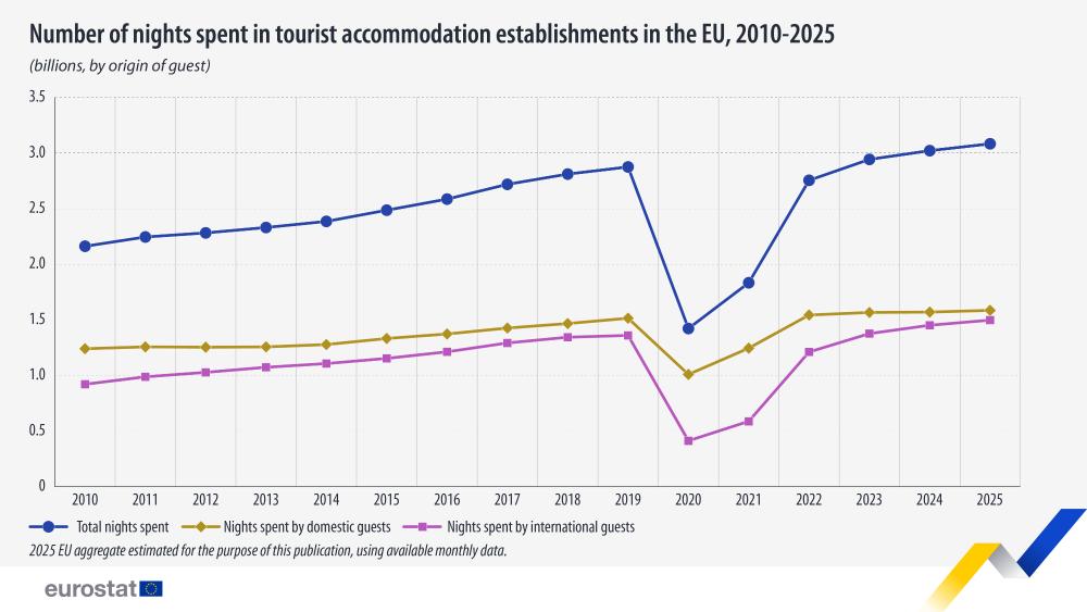 Οι διανυκτερεύσεις σε τουριστικά καταλύματα στην Ευρωπαϊκή Ένωση έφτασαν σε ιστορικό υψηλό το 2025, αγγίζοντας τα 3,08 δισεκατομμύρια, σύμφωνα με προκαταρκτικά στοιχεία που δημοσίευσε η Eurostat. Το μέγεθος αυτό αντιστοιχεί σε αύξηση κατά 61,5 εκατομμύρια διανυκτερεύσεις, ή 2%, σε σύγκριση με το 2024.