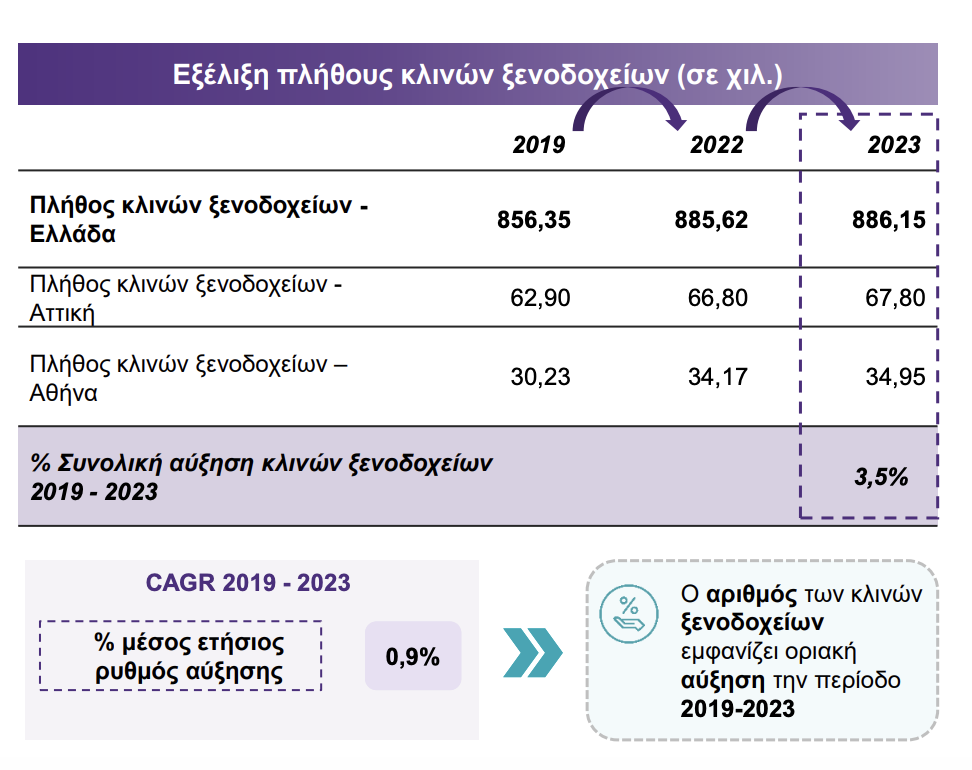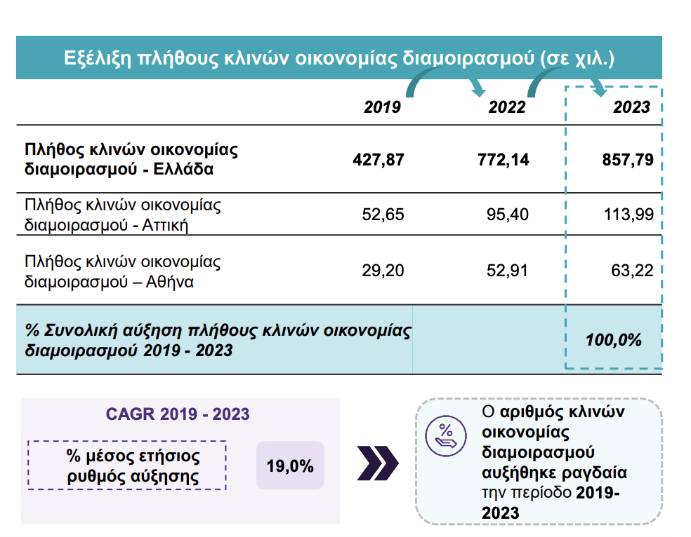 Ενδεικτικά, ενώ το πλήθος κλινών των ξενοδοχείων το 2019 ήταν λίγο πάνω από τις 856 χιλ. με 428 χιλιάδες τις κλίνες στην οικονομία διαμοιρασμού σε όλη τη χώρα, εν έτει 2023 τα αντίστοιχα μεγέθη ήταν λίγο πάνω από τις τις 886 χιλιάδες για τις ξενοδοχειακές μονάδες και 858 χιλιάδες στα λεγόμενα ‘’Airbnb’’. Η αύξηση στα ξενοδοχεία την περίοδο 2019-2023 αντιστοιχεί στο 3,5%, όταν στην οικονομία διαμοιρασμού είναι στο 100%. Στην Αττική ευρύτερα αλλά και στην Αθήνα ειδικότερα οι κλίνες στα καταλύματα βραχυχρόνιας μίσθωσης ξεπερνούν κατά πολύ πλέον τις ξενοδοχειακές.