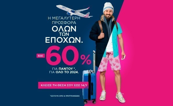 Με αυτή τη μοναδική προσφορά οι επιβάτες της SKY express γιορτάζουν το 2024 με έως 60% έκπτωση σε οποιονδήποτε προορισμό της πραγματοποιώντας την κράτησή τους μέχρι τις 14/01/2024.
