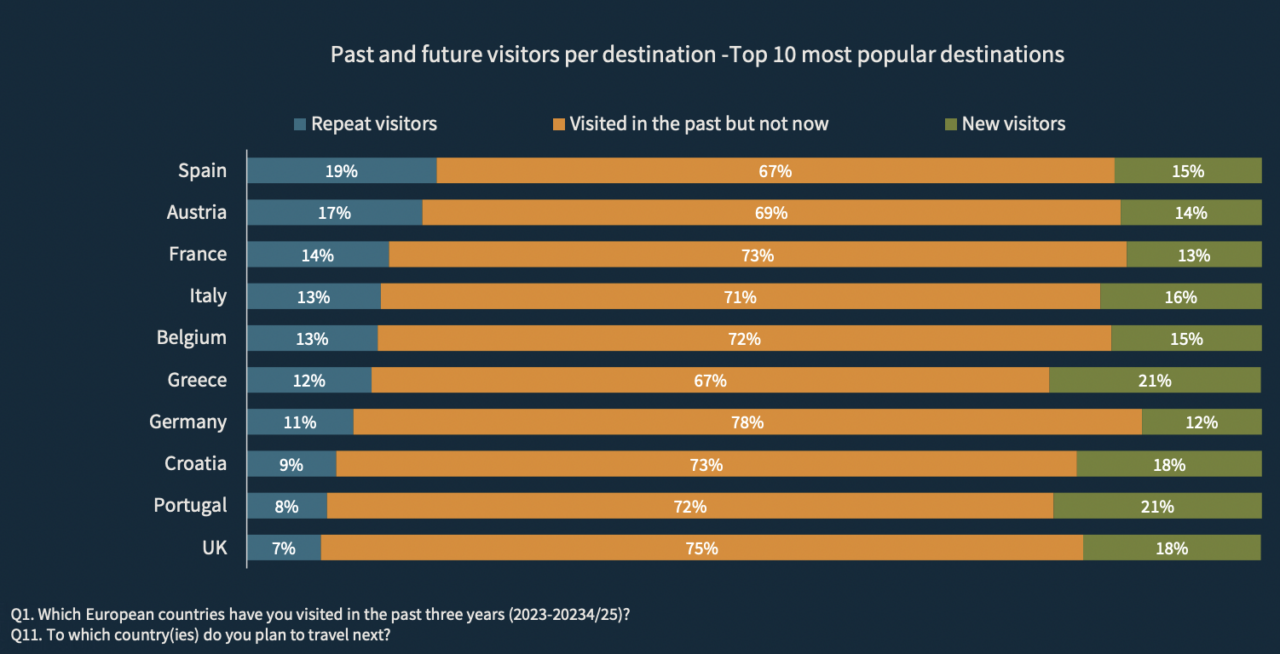 Από το σύνολο των 10 δημοφιλέστερων ευρωπαϊκών προορισμών η Ισπανία έχει το μεγαλύτερο αριθμό επαναλαμβανόμενων επισκεπτών (με βάση τα ταξίδια της περιόδου 2023- 2024) φτάνοντας το 19%, με την Ελλάδα να βρίσκεται χαμηλότερα, στην 6η θέση με ένα 12%, πίσω από άλλους ανταγωνιστικούς προορισμούς όπως η Γαλλία και Ιταλία που έχουν αντίστοιχα ποσοστά 14% και 13%. Από την άλλη πλευρά όμως η χώρα μας μαζί με την Πορτογαλία καταγράφουν τα μεγαλύτερα ποσοστά νέων επισκεπτών στο 21% και για τις δύο αγορές όσον αφορά τα μελλοντικά ταξίδια.