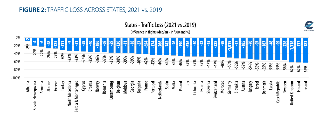 Χαρακτηριστικό αποτελεί το γεγονός ότι το 2021 τα μεγάλα βρετανικά αεροδρόμια είχαν τις μεγαλύτερες απώλειες πανευρωπαϊκά σε αριθμό πτήσεων με μείον 1,318 εκατ. πτήσεις σε σύγκριση με την περίοδο της κανονικότητας και ακολουθεί η Γερμανία με μείον 1,019 εκατ. λιγότερες πτήσεις ή αλλιώς στο 50% του 2019. Ισπανία με μείον 742.000 πτήσεις (-44%), μετά η Γαλλία με μείον 654.000 (-42%) και Ιταλία με μείον 616.000 (-47%) συμπληρώνουν την πεντάδα με τις μεγαλύτερες αριθμητικές απώλειες.