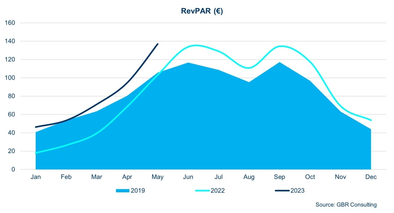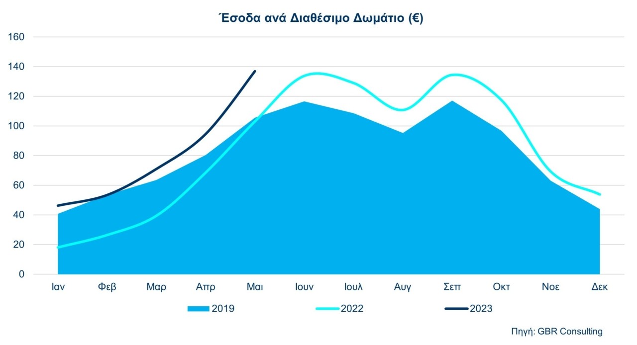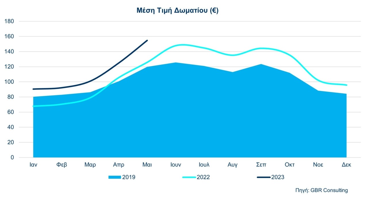 Σε επίπεδο πόλεων – ανταγωνιστών ωστόσο, τα στοιχεία πενταμήνου 2023 δείχνουν πως εξακολουθούμε να υστερούμε έναντι (όλων) των ανταγωνιστών μας και να διαθέτουμε την πλέον χαμηλή μέση τιμή δωματίου. Για του λόγου το αληθές, η αντίστοιχη μέση τιμή δωματίου λ.χ. στην Κωνσταντινούπολη είναι 134.22 ευρώ (αύξηση έναντι του 2019 της τάξης του 66,8%), στην Μαδρίτη 142.11 ευρώ (αύξηση έναντι του 2019 της τάξης του 28,8%), στην Βαρκελώνη 164.20 ευρώ (αύξηση έναντι του 2019 της τάξης του 22,4%), στην Ρώμη 203.79 ευρώ (αύξηση έναντι του 2019 της τάξης του 43,8%), στο Παρίσι 294.02 ευρώ (αύξηση έναντι του 2019 της τάξης του 49,8%), κ. ο. κ.