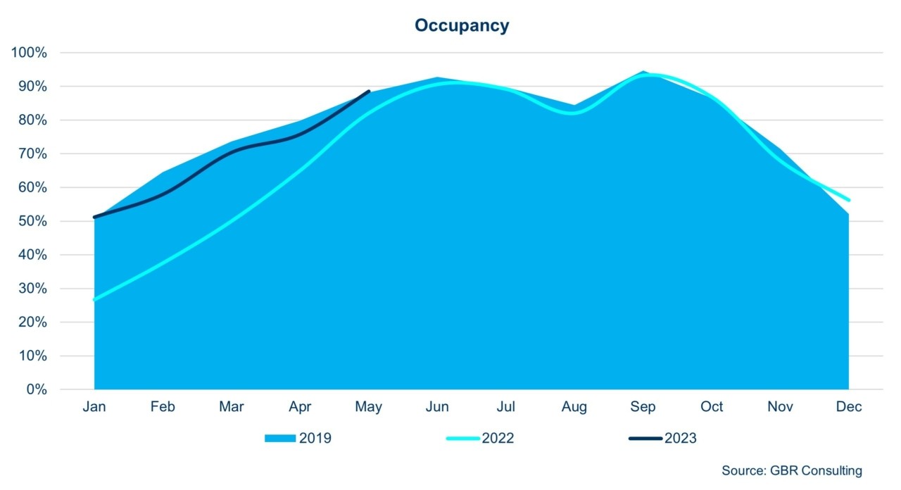 Η μέση πληρότητα στα ξενοδοχεία τον μήνα Μάϊο, προσέγγισε το 88,5%, δηλαδή βελτιώθηκε κατά 7,9% έναντι του Μαΐου 2022. Σε επίπεδο πενταμήνου, δεν ξεπέρασε το 68,9% και απέχει κατά (-) 4,0% από τις επιδόσεις του αντίστοιχου πενταμήνου του 2019 – έτος κανονικότητας προ πανδημίας, με το οποίο ως γνωστόν συγκρίνουμε τις επιδόσεις των ξενοδοχείων της Αθήνας.