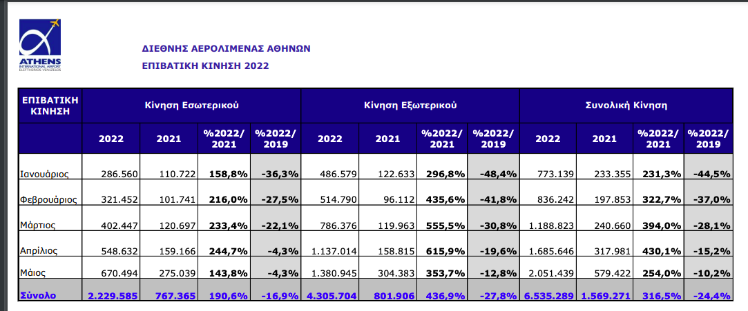 Συγκεντρωτικά κατά τη διάρκεια των πέντε πρώτων μηνών της φετινής χρονιάς, η επιβατική κίνηση του μεγαλύτερου αεροδρομίου της χώρα μας ανήλθε, όπως προαναφέρθηκε, σε 6,5 εκατ. από μόλις 1,57 εκατ. του πρώτο πενταμήνου του 2021, ενώ κατά το ίδιο διάστημα του 2019, το αντίστοιχο νούμερο ήταν στα 8,6 εκατ. επιβάτες. Φέτος, οι επιβάτες εσωτερικού παρέμειναν κάτω από τα επίπεδα του 2019 κατά 16,9%, φθάνοντας συνολικά τα 2,23 εκατ., ενώ οι διεθνείς επιβάτες κατά 27,8% στα 4,3 εκατομμύρια.