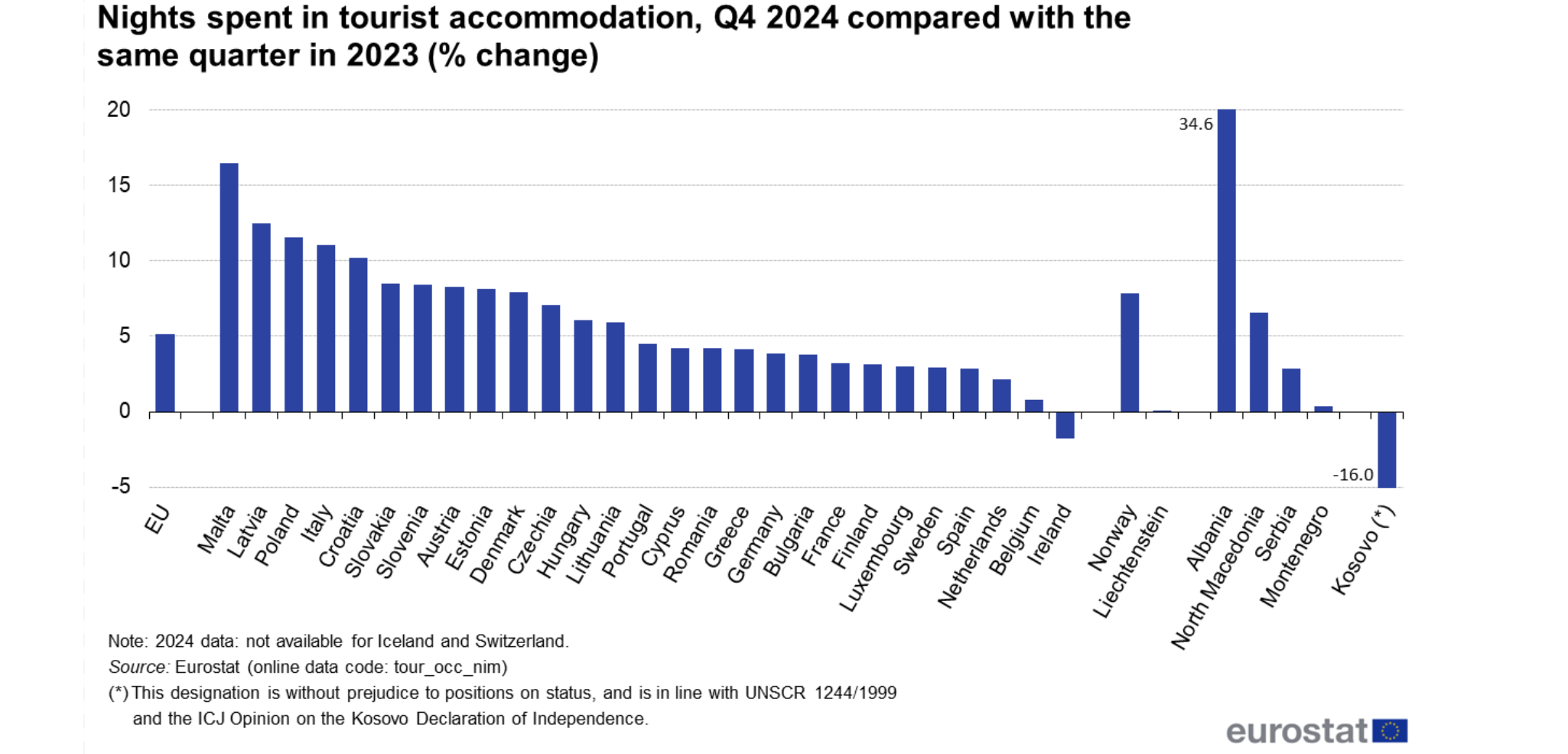 Σε 23 από τις 27 χώρες της ΕΕ, οι διανυκτερεύσεις το 2024 υπερέβησαν τα επίπεδα του 2023, μόνο στη Σουηδία (-0,1%), στο Βέλγιο (-0,2%), στη Γαλλία (-0,6 %) και στο Λουξεμβούργο (-2,7 %) υπήρξε μείωση. Η Μάλτα κατέγραψε διψήφιο ρυθμό ανάπτυξης (+14,4%) και ακολουθούν με Λετονία (+7,4%) και Πολωνία (+5,2%).
