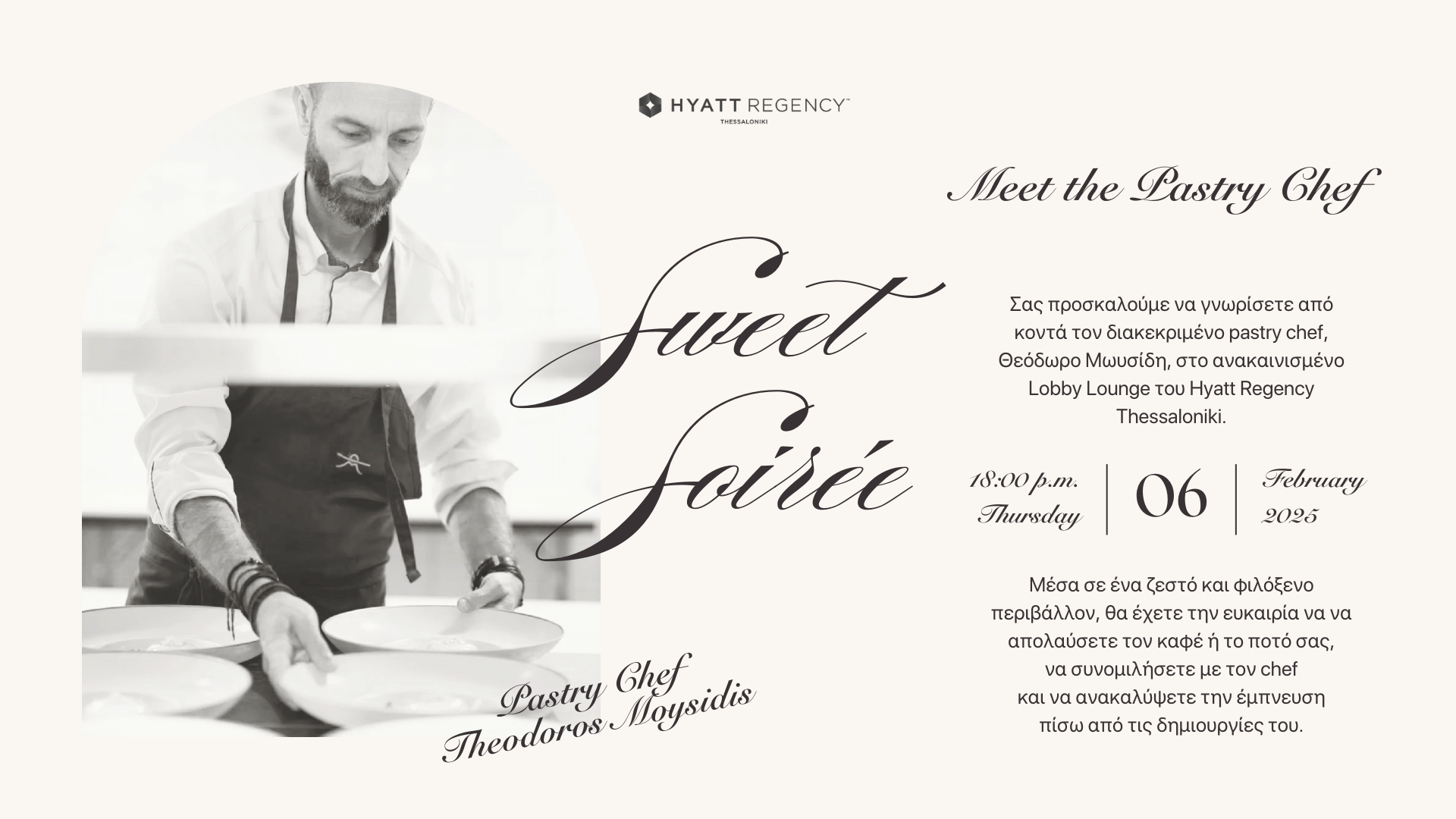 Την Πέμπτη 6 Φεβρουαρίου, στις 18:00, σας προσκαλεί να γνωρίσετε από κοντά τον διακεκριμένο pastry chef Θεόδωρο Μωυσίδη, στο ανακαινισμένο Lobby Lounge του Hyatt Regency Thessaloniki. Μέσα σε ένα ζεστό και φιλόξενο περιβάλλον, θα έχετε την ευκαιρία να απολαύσετε τον καφέ σας ή το ποτό σας, να συνομιλήσετε με τον chef και να ανακαλύψετε την έμπνευση πίσω από τις δημιουργίες του.
