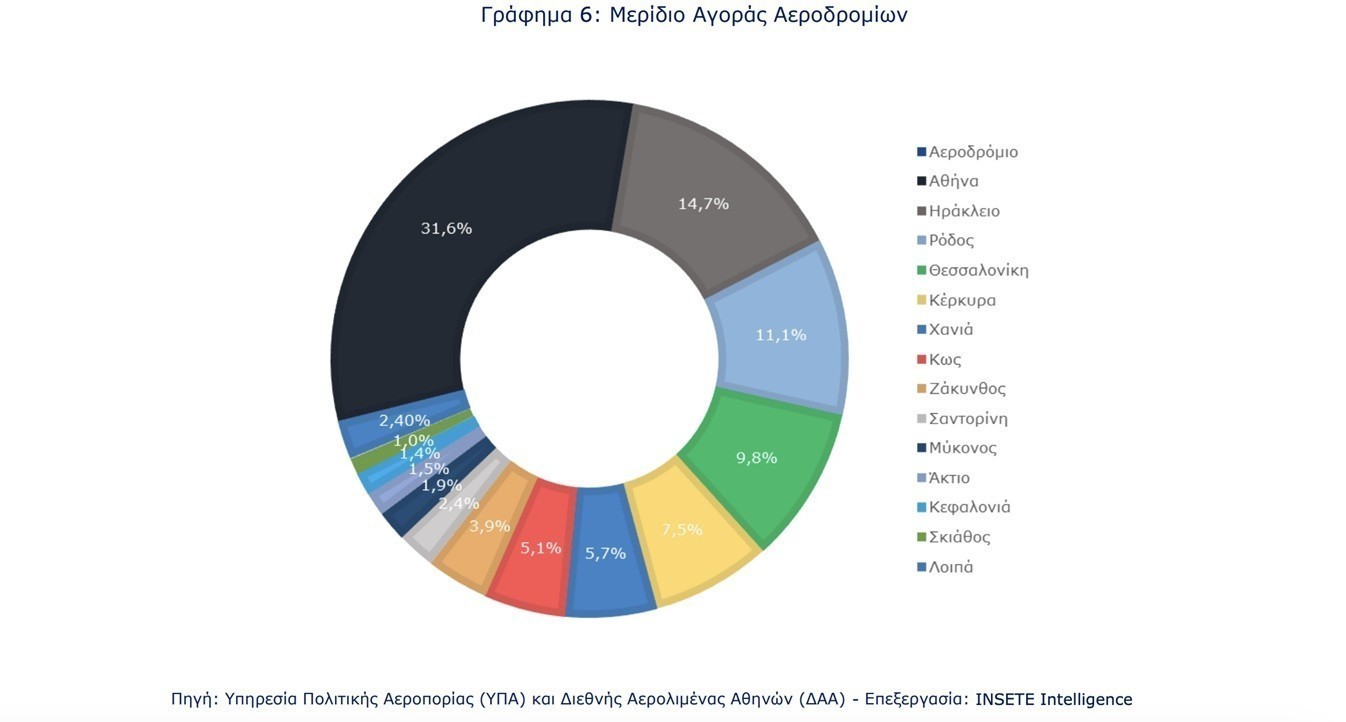 Οσον αφορά τα μερίδια των ελληνικών αεροδρομίων. με βάση την επεξεργασία από το Ινστιτούτο του Συνδέσμου Τουριστικών Επιχειρήσεων (ΙΝΣΕΤΕ) για το 2025, οι διεθνείς αεροπορικές αφίξεις αντιστοιχούν στο 74,6% των συνολικών αφίξεων στην πρώτη πεντάδα των αεροδρομίων, με το Διεθνή Αερολιμένα της Αθήνας να υποδέχεται το 31,6% των εισερχόμενων διεθνών αεροπορικών αφίξεων το 2025, διατηρώντας την πρώτη θέση, απορροφώντας σχεδόν 1 στις 3 διεθνείς αφίξεις. Στη δεύτερη θέση βρέθηκε το Ηράκλειο με 14,7%, ενώ στην τρίτη θέση ακολούθησε η Ρόδος με 11,1%. Τέταρτη είναι η Θεσσαλονίκη με 9,8% και στην πέμπτη θέση η Κέρκυρα με 7,5%. Χανιά, Κως, Ζάκυνθος, Σαντορίνη και Μύκονος συμπληρώνουν τη δεκάδα, ενώ συνολικά, οι αφίξεις στα δέκα αεροδρόμια αντιστοιχούν στο 93,6% των συνολικών διεθνών αεροπορικών αφίξεων το 2025.