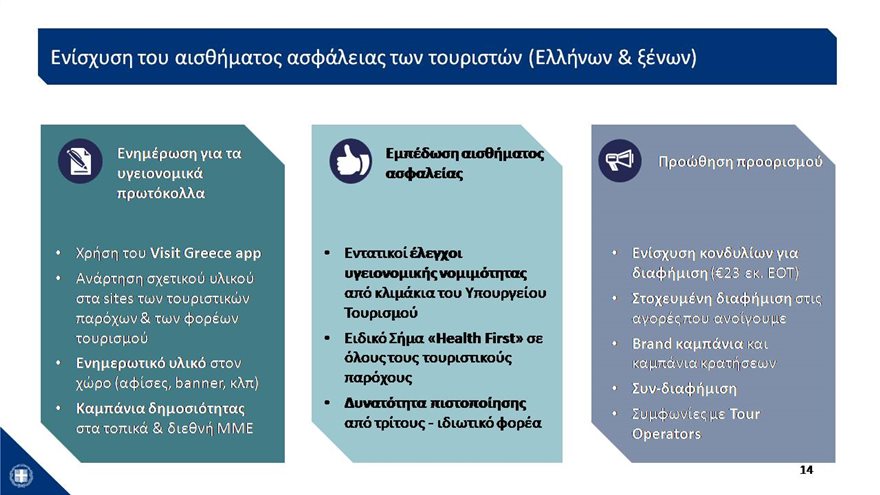 Ο κ. Θεοχάρης ανέφερε ότι θα εφαρμοστούν υγειονομικά πρωτόκολλα για τη λειτουργία τουριστικών καταλυμάτων, τουριστικών Λεωφορείων, τη λειτουργία επιχειρήσεων ενοικιάσεων αυτοκινήτων, τις θαλάσσιες μεταφορές στα επιβατηγά / επιβατηγά – οχηματαγωγά πλοία, τις αεροπορικές μεταφορές, εντός του αεροπλάνου,