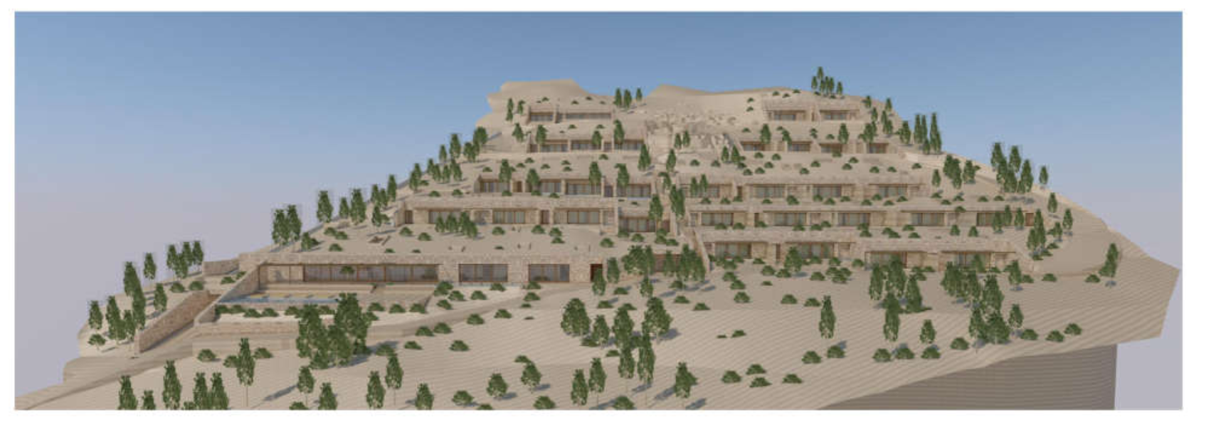 Το ξενοδοχείο αποτελείται από 10 κτίρια εκ των οποίων το πρώτο κτίριο θα αποτελεί το κεντρικό κτίριο/ κτίριο υποδοχής με την κοινόχρηστη πισίνα και τους χώρους εστίασης, ενώ στα υπόλοιπα 9 κτίρια οργανώνονται τα 31 δωμάτια με ιδιωτικές πισίνες. Για την εξυπηρέτηση της πρόσβασης στις επιμέρους εγκαταστάσεις, λόγω και της υψομετρικής διαφοράς της έκτασης, προβλέπεται η κατασκευή επίγειου τελεφερίκ – επικλινούς ανελκυστήρα ως συνοδό έργο του ξενοδοχείου. Το τελεφερίκ θα έχει αφετηρία το κεντρικό κτίριο και θα καταλήγει στην απόληξη του ξενοδοχειακού συγκροτήματος στο νότιο-ανατολικό τμήμα του ακινήτου. Επίσης προβλέπεται και belvedere –κελί, ένας υπαίθριος διαμορφωμένος χώρος δίπλα σε μια υφιστάμενη λιθόκτιστη αγροτική αποθήκη (κελί), η οποία διατηρείται, αποκαθίσταται και θα περιβάλλεται από υδάτινο στοιχείο προσφέροντας απεριόριστη θέα. «Βασική παράμετρος της αρχιτεκτονικής σύνθεσης είναι η διατήρηση της μορφολογικής ιδιαιτερότητας και η εναρμόνιση του ξενοδοχειακού συγκροτήματος με το επιβλητικό τοπίο. Το συγκρότημα αποτελείται από ανεξάρτητα κτιριακά υπόσκαφα, γεωμετρικά κτίρια, με απλές και καθαρές γραμμές. Τα παραπάνω τοποθετούνται σε διαφορετικά επίπεδα, ακολουθώντας τις υψομετρικές καμπύλες του γηπέδου». Η συνολική κάλυψη αντιστοιχεί σε 1.473 τ.μ. και η δόμηση σε 1.448 τ.μ.