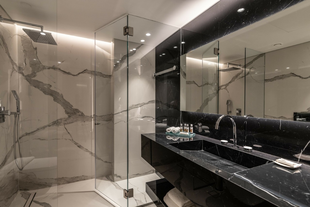 Τα λουτρά ανακατασκευάστηκαν πλήρως, με την αποξήλωση όλης της παλιάς υδραυλικής εγκατάστασης και αντικατάσταση με μία νέα, σύγχρονη εγκατάσταση που συμβάλει στην άνεση του δωματίου με τη χρήση ηχομονωτικών σωληνώσεων και επιτρέπει την εύκολη συντήρηση τους, καθώς η νέα εγκατάσταση του κεντρικού δικτύου ύδρευσης επιτρέπει την αποκοπή του κάθε δωματίου ξεχωριστά αλλά και της κάθε παροχής.