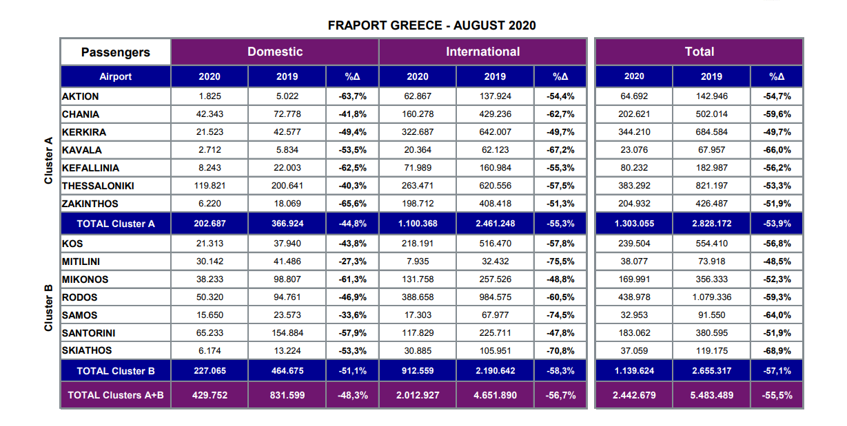 Συνολικά στα αεροδρόμια που διαχειρίζεται η Fraport η πτώση της επιβατικής κίνησης για τον πιο κρίσιμο μήνα της σεζόν ήταν στο 55,5% στα 2,44 εκατ. επιβάτες από 5,48 εκατ. επιβάτες τον αντίστοιχο περυσινό μήνα. Ανά εθνικότητα, οι αφίξεις από Βρετανία άγγιξαν στις 316.000 στα 14 περιφερειακά αεροδρόμια, με δεύτερους τους Γερμανούς με σχεδόν 206.000 αφίξεις, ακολουθούν οι Πολωνοί με ένα νούμερο λίγο κάτω από τις 82.000 αφίξεις μέσα στον Αύγουστο και έπονται οι Ιταλοί και οι Ολλανδοί με 70.500 και 52.300 αφίξεις αντίστοιχα.