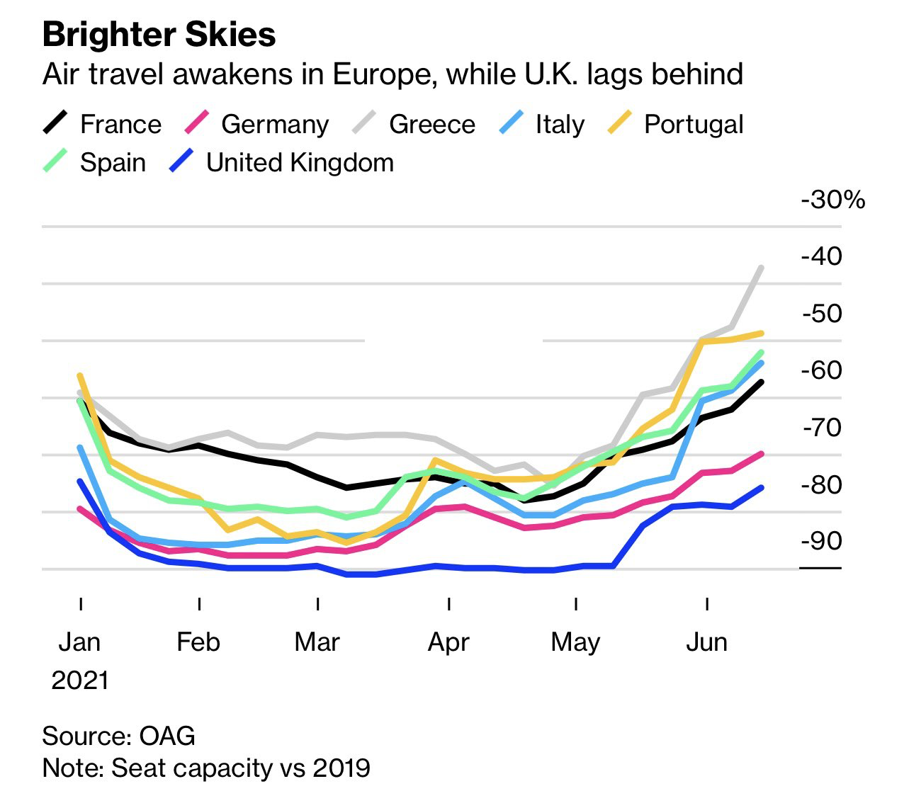 Όσον αφορά τα μηνύματα από …αέρος, τα στοιχεία για την πορεία συγκεκριμένων, μεγάλων αγορών στην ευρύτερη περιοχή μας- σε Ισπανία, Γαλλία, Ιταλία και Πορτογαλία- είναι ενδεικτικά με τη χώρα μας στο τέλος Ιουνίου να είναι στο μείον 40% κάτω σε σύγκριση με την ίδια περίοδο το 2019 και ακολουθεί η Πορτογαλία με μείον 53%, με μικρή διαφορά η Ισπανία με -56% και η Ιταλία με -58%.