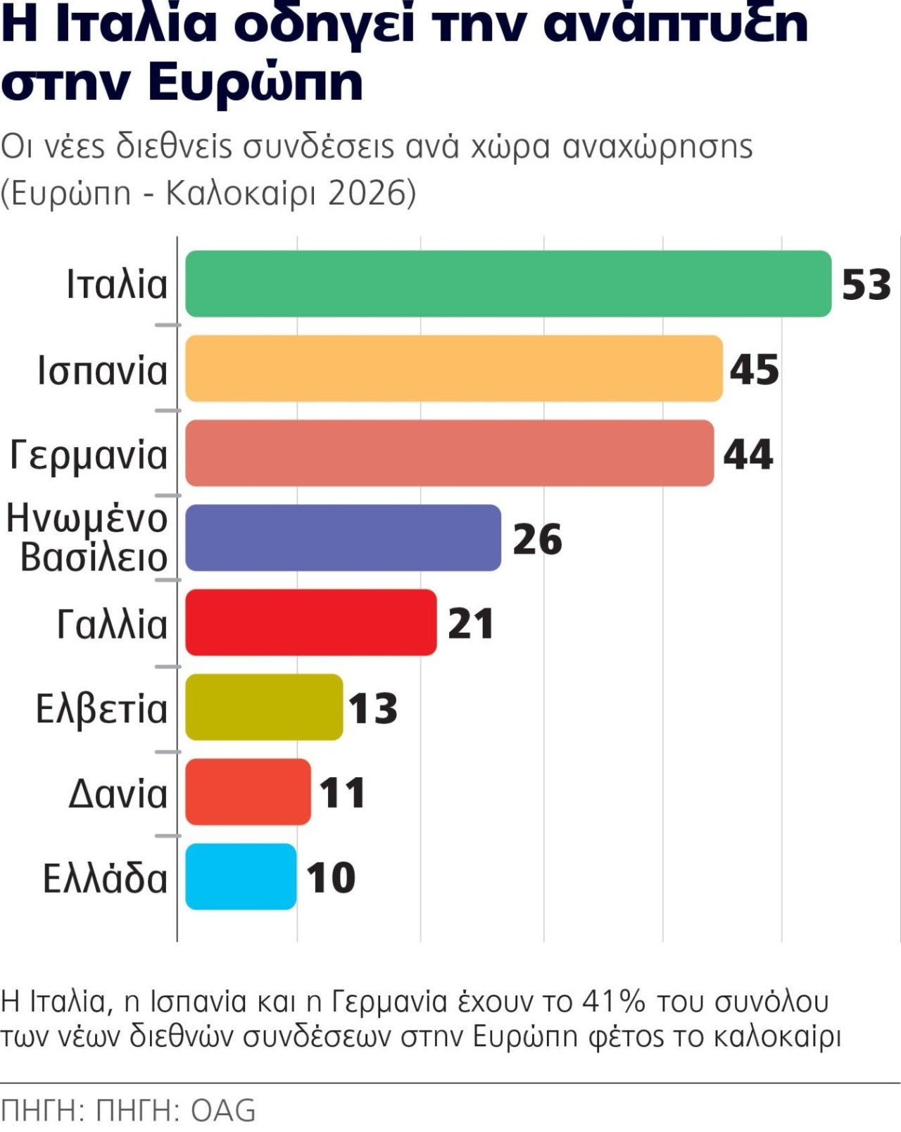 Η Ελλάδα κινείται θετικά και σε σχέση με τις ανταγωνίστριες αγορές στη Μεσόγειο, όπως προκύπτει με βάση τα στοιχεία του OAG, του διεθνούς παρόχου ψηφιακών δεδομένων αερομεταφορών με αναλυτικά στοιχεία για όλα τα αεροδρόμια. Καταγράφοντας τη μεγάλη εικόνα διεθνώς, ο OAG διαπιστώνει για το φετινό καλοκαίρι, και με βάση τα θερινά προγράμματα που έχουν ανακοινώσει ήδη οι αεροπορικές, ότι η Ευρώπη καταγράφει τα υψηλότερα επίπεδα ανάπτυξης νέων δρομολογίων στο δίκτυο εξωτερικού (σε σύγκριση με τις γεωγραφικές περιοχές Ασίας – Ειρηνικού, Βόρειας Αμερικής, Λατινικής Αμερικής κ.ο.κ.), με περισσότερα από 400 νέα διεθνή δρομολόγια. Σε καθαρή βάση -λαμβάνοντας δηλαδή υπόψη τα δρομολόγια που λειτούργησαν το καλοκαίρι του 2025 αλλά δεν θα πραγματοποιηθούν το καλοκαίρι του 2026- ο αριθμός αυτός διαμορφώνεται στα 220, με βάση δρομολόγια που εκτελούνται τουλάχιστον 3 φορές την εβδομάδα, «γεγονός που υποδηλώνει υψηλό βαθμό ανανέωσης του δικτύου», όπως επισημαίνεται σχετικά. Εντός Ευρώπης, πρώτη κατατάσσεται η Ιταλία με 53 νέα δρομολόγια, ακολουθούμενη από την Ισπανία (45) και τη Γερμανία (44). «Το Ηνωμένο Βασίλειο, η Γαλλία, η Ελβετία, η Δανία και η Ελλάδα (σ.σ.: η χώρα μας με 10 νέες διεθνείς συνδέσεις) καταγράφουν επίσης ισχυρή ανάπτυξη, αντανακλώντας την αυξημένη ζήτηση των καταναλωτών τόσο για ταξίδια αναψυχής όσο και για επαγγελματικά ταξίδια το φετινό καλοκαίρι», όπως επισημαίνει ο ΟΑG.