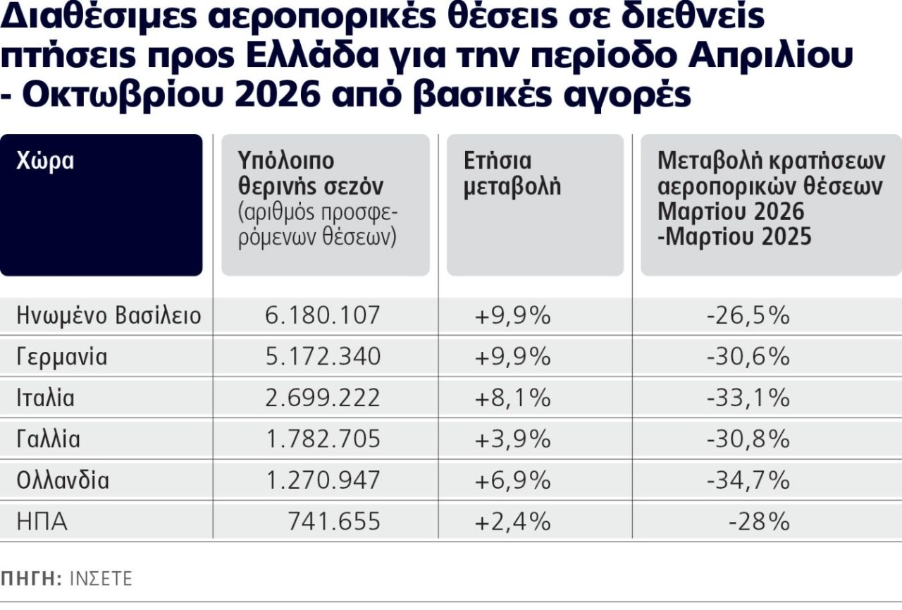 Σε επίπεδο προσφοράς, πάντως, τα στοιχεία είναι ενθαρρυντικά αφού έπειτα από μια χρονιά-ρεκόρ για τα ελληνικά αεροδρόμια το 2025, οι αεροπορικές εταιρείες δίνουν εκ νέου ψήφο εμπιστοσύνης στους ελληνικούς προορισμούς: τα στοιχεία από το ΙΝΣΕΤΕ για τις προσφερόμενες θέσεις από τις αεροπορικές φέτος σε εισερχόμενες διεθνείς πτήσεις παραπέμπουν σε περαιτέρω άνοδο που μεταφράζεται, όπως προαναφέρθηκε, σε 30,82 εκατομμύρια προσφερόμενες θέσεις από τον Μάρτιο έως και τον Οκτώβριο και για το υπόλοιπο της σεζόν, εξαιρουμένου δηλαδή του Μαρτίου αντιστοιχούν, από τον τρέχοντα μήνα έως και τον Οκτώβριο στις 30,63 εκατομμύρια θέσεις με ένα +8,9%. Σε μηνιαία βάση, ο καλύτερος μήνας είναι ο Οκτώβριος με +21% έναντι του Οκτωβρίου του 2025 και ένα σύνολο πάνω από 3,58 εκατομμύρια θέσεις. Ακολουθεί ο Σεπτέμβριος με +8,6% και 4,85 εκατομμύρια προσφερόμενες θέσεις και το θερμό δίμηνο Ιουλίου – Αυγούστου με +8,4% (5,65 εκατομμύρια θέσεις) και +8% (5,69 εκατομμύρια) προσφερόμενες θέσεις αντίστοιχα όσον αφορά τις εισερχόμενες, διεθνείς πτήσεις. Πρώτη αγορά είναι αυτή του Ηνωμένου Βασιλείου με 6,18 εκατομμύρια προσφερόμενες θέσεις για το υπόλοιπο της σεζόν έως και τον Οκτώβριο και αύξηση κατά 9,9%, δεύτερη η Γερμανία με 5,17 εκατομμύρια προσφερόμενες θέσεις και αύξηση κατά 9,9%.