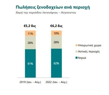 Υπό αυτές τις συνθήκες και με τη δαπάνη ανά άφιξη να διατηρεί τη δυναμική των προηγούμενων μηνών, οι συνολικές εισπράξεις του 2022 αναμένεται να ξεπεράσουν οριακά το επίπεδο του 2019, λίγο πάνω από τα 18 δισ. ευρώ.