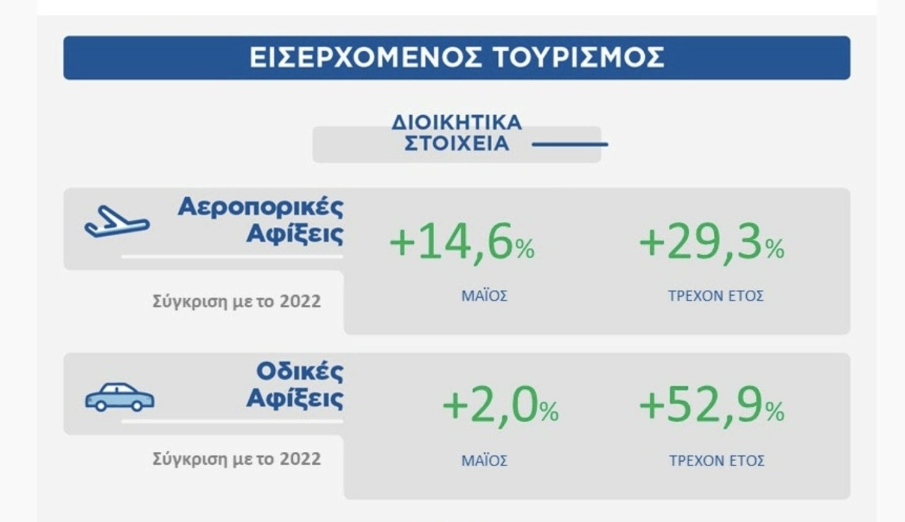 Μόνο για το μήνα Μάιο, ο οποίος κατά τις διαπιστώσεις των ξενοδόχων και λοιπών τουριστικών φορέων, δεν είχε την ίδια εικόνα σε όλους τους προορισμούς, οι διεθνείς αεροπορικές αφίξεις ανήλθαν σε 2,6 εκατομμύρια παρουσιάζοντας αύξηση +14,6%/+325 χιλ. σε σχέση με τον Μάιο του 2022 και + 8,7% σε σχέση με τον Μάιο του 2019.