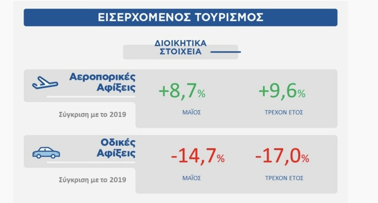 Μόνο για το μήνα Μάιο, οι διεθνείς οδικές αφίξεις διαμορφώθηκαν σε 581 χιλιάδες παρουσιάζοντας αύξηση 2% σε σχέση με πέρυσι και μείωση -14,7% σε σχέση με το 2019.