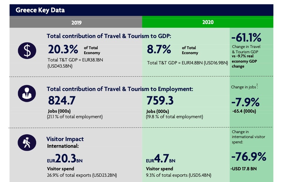 -Το 2019 η συνολική συμβολή (έμμεση και άμεση) του κλάδου ταξιδίων και τουρισμού στο ελληνικό ΑΕΠ ήταν 20,3% επί του συνόλου της οικονομίας ή αλλιώς 38,1 δισ. ευρώ. Το 2020 το νούμερο αυτό έπεσε στο 8,7% ή αλλιώς στα 14,8 δις. ευρώ.