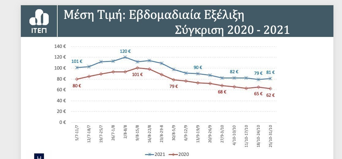 Σε σχέση με τις τιμές στα ανοικτά ξενοδοχεία στο τέλος Οκτωβρίου είναι στα 81 ευρώ, ενώ μέσα στον Αύγουστο μεσοσταθμικά ήταν στα 114 ευρώ.