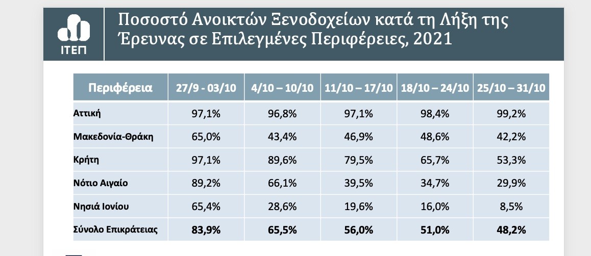 Ως προς τα ευρήματα της έρευνας του ΙΤΕΠ, η ανάκαμψη του τουρισμού δεν ήταν οριζόντια και η διάρκεια της φετινής τουριστικής σεζόν στην Ελλάδα ήταν βραχύβια. Η μέση πληρότητα στα ανοιχτά ξενοδοχεία εποχικής λειτουργίας έφτασε στο peak σε ποσοστό 83,7% την εβδομάδα από τις 9 έως 15 Αυγούστου, με τις συνεχούς λειτουργίας μονάδες το ίδιο διάστημα να σημειώνουν πληρότητα 70,8%.