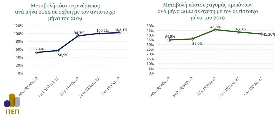 Σύμφωνα με τα στοιχεία, όπως αυτά παρουσιάστηκαν από την πρόεδρο του ΙΤΕΠ Κωνσταντίνα Σβύνου στη γενική συνέλευση του ΞΕΕ, στη φετινή έκθεση ΧΕΝΙΑ τον Οκτώβριο του 2022, η μεταβολή του κόστους ενέργειας σε σχέση με τον αντίστοιχο μήνα του 2019 είναι υπερδιπλάσιο κι εμφανίζεται αυξημένο κατά 102,1%. Στον πιο «θερμό» μήνα του καλοκαιριού, μέσα στον Αύγουστο, το ενεργειακό κόστος ήταν αυξημένο κατά 94,3% έναντι του αντίστοιχου μήνα του 2019. Αντίστοιχα, σημαντικά αυξημένο, κατά 41,2% καταγράφεται φέτος και το κόστος αγοράς προϊόντων τώρα σε σύγκριση με τον Οκτώβριο του 2019, ελαφρώς χαμηλότερο πάντως σε σύγκριση με το peak της σεζόν, μέσα στον Αύγουστο, όταν η «ψαλίδα» έναντι του Αυγούστου του 2019 ήταν στο +45,8%.