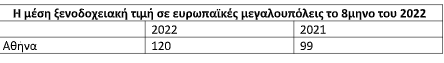 Μόνο για το μήνα Αύγουστο, η μέση τιμή των ξενοδοχείων της Αθήνας διαμορφώθηκε στα 135 ευρώ, έχοντας αυξηθεί κατά 33% έναντι του 2021 και κατά 19,5% έναντι του 2019, χρονιά κατά την οποία το αντίστοιχο νούμερο ήταν στα 113 ευρώ.