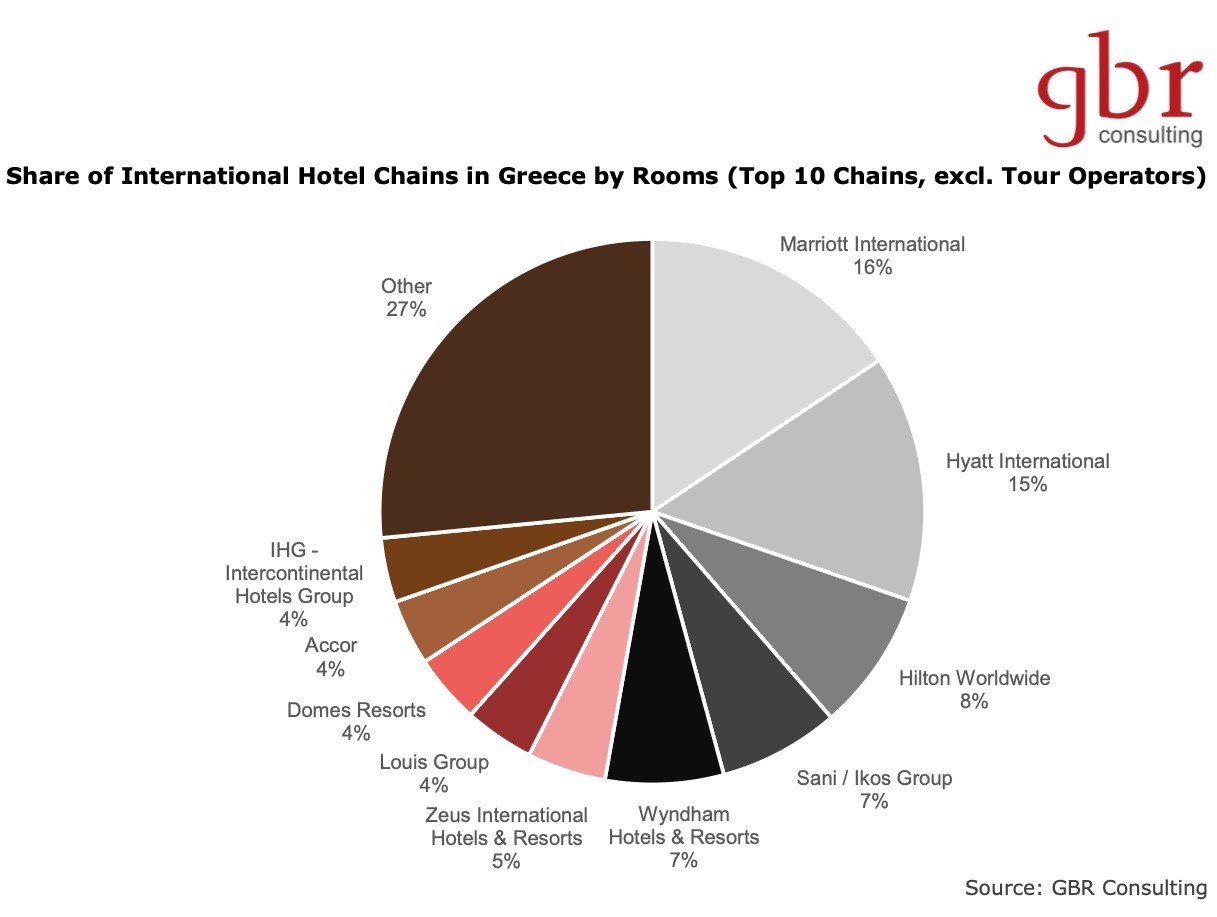 Αυτή τη στιγμή 41 διεθνείς αλυσίδες έχουν παρουσία στη χώρα μας, με 399 μονάδες καταλυμάτων και συνολικά 37.298 δωμάτια. Επιπλέον, υπάρχουν 59 εγχώριες αλυσίδες (όμιλοι Grecotel, Μitsis, H Hotels, Εmpiria Group κ.ά.) με 351 μονάδες και 48.969 δωμάτια και 64 τοπικές αλυσίδες με 296 μονάδες και 29.948 δωμάτια.