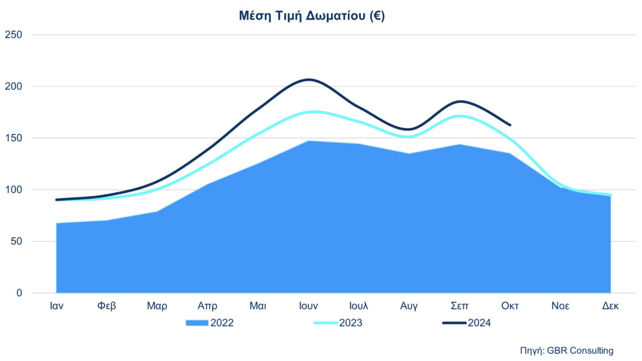 Από το «μέτωπο» των ξενοδοχείων ανά την Ελλάδα, με βάση τα στοιχεία από το Ινστιτούτο Τουριστικών Ερευνών και Προβλέψεων, για το μήνα Οκτώβριο οι επιδόσεις των ξενοδοχείων ανά την Ελλάδα ήταν αυξητικές: ενδεικτικά η μέση τιμή διαθέσεις ενός δίκλινου δωματίου το φετινό Οκτώβριο ήταν στα 114 ευρώ, έναντι 101 ευρώ τον Οκτώβριο του 2023. Η μέση πληρότητα στα ξενοδοχεία τον Οκτώβριο του 2024 ήταν στο 63,9%, νούμερο που έχει αυξηθεί σημαντικά σε σχέση με το 57,4% του Οκτωβρίου του 2023.