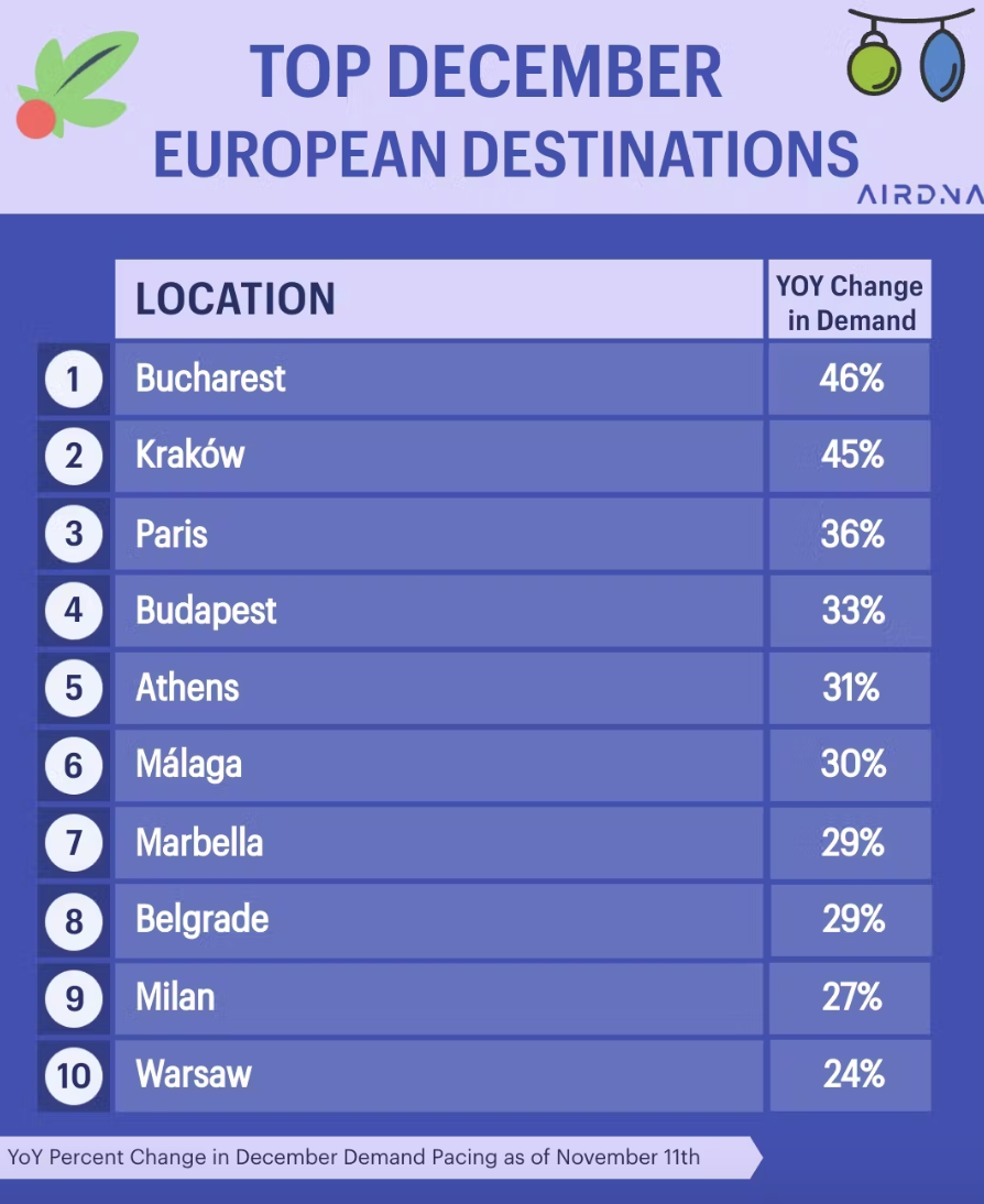 Οσον αφορά τη βραχυχρόνια μίσθωση, με βάση τα στοιχεία από την εξειδικευμένη εταιρεία αναλύσεων δεδομένων AirDNA, η Ελλάδα στην πρώτη θέση (+6,7%), με δεύτερη την Ισπανία (+6,3%) και την Κροατία (+6%) να ακολουθεί ήταν αυτή που παρουσίασε τη μεγαλύτερη αύξηση στις πληρότητες για τον Οκτώβριο πανευρωπαϊκά. «Η …γοητεία της Νότιας Ευρώπης αποδείχθηκε …ακαταμάχητη στο τέλος της σεζόν, με τους ταξιδιώτες να κυνηγούν τις τελευταίες ακτίνες του ήλιου της Μεσογείου», σχολιάζει η ανάλυση της AirDNA. Η αύξηση της ζήτησης στην Ελλάδα καταγράφηκε παρά το γεγονός ότι οι διαθέσιμες καταχωρήσεις παρουσίασαν επίσης αύξηση σε ποσοστό 10% σε σύγκριση με τον Οκτώβριο του 2023. Ακριβώς λόγω της υψηλής ζήτησης οι αγορές της Νότιας Ευρώπης κατάφεραν να συγκρατήσουν σε υψηλότερα επίπεδα τις τιμές, οι οποίες ούτως ή άλλως βρίσκονται σε αποκλιμάκωση μετά την περίοδο της υψηλής αιχμής του Αυγούστου. Ενδεικτικά στην Ελλάδα η μέση τιμή σημείωσε πτώση κατά 25% τον Οκτώβριο σε σύγκριση με τον Αύγουστο όταν το αντίστοιχο ποσοστό πέρυσι ήταν στο -29%. Η Αθήνα ειδικά παρουσιάζει διψήφιο ποσοστό αύξησης της ζήτησης, κοντά στο +22% τον Οκτώβριο και βρίσκεται πάνω από τον ευρωπαϊκό μέσο όρο. Αντίστοιχα, η ελληνική πρωτεύουσα παραμένει και στο τοπ 5 των ευρωπαϊκών προορισμών με την υψηλότερη αύξηση της ζήτησης για την περίοδο των Χριστουγέννων, με ένα +31% σε σύγκριση με πέρυσι (με βάση τα στοιχεία έως τις 11 Νοεμβρίου).