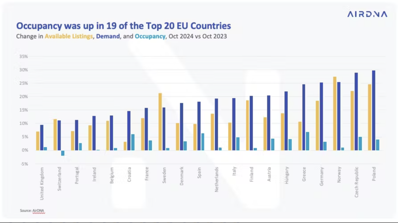 Πανευρωπαϊκά, οι διαθέσιμες καταχωρήσεις παρουσίασαν ακόμη μεγαλύτερη αύξηση κατά 12% σε ετήσια βάση, φτάνοντας συνολικά τα 3,6 εκατομμύρια, η ζήτηση έφτασε τα 36,9 εκατ. διανυκτερεύσεις, σημειώνοντας αύξηση 17,7% σε ετήσια βάση, ενώ οι μέσες ημερήσιες τιμές (ADR) ήταν κατά μέσο όρο στα 158 ευρώ, αυξημένες κατά 9,8% σε ετήσια βάση. Η μέση πληρότητα ήταν 53%, με αύξηση 3,5% σε ετήσια βάση και άνοδο 13,2% σε σύγκριση με το 2019