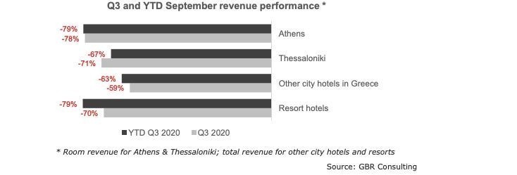 Όπως χαρακτηριστικά επισημαίνει η εταιρεία στην τελευταία της ανάλυση για το τρίτο τρίμηνο του 2020, τα μεγάλα ποσοστά της πτώσης αντανακλούν και το γεγονός ότι μετά το lockdown της περασμένης άνοιξης πολλά ξενοδοχεία παρέμειναν κλειστά ή άνοιξαν για να …ξανακλείσουν στη συνέχεια. Η gbr consulting καταγράφει την πτώση στα έσοδα των ξενοδόχων ειδικότερα και κατά τη διάρκεια του τρίτου τριμήνου της φετινής σεζόν Covid -19 όπου σύμφωνα με τα στοιχεία: