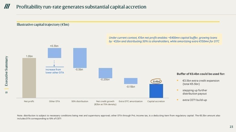 Μετά τη διανομή μερίσματος και την αυξημένη διακράτηση περίπου 150 εκατ. ευρώ για την ταχύτερη απόσβεση του DTC, με εκτίμηση κερδών 1 δισ. ευρώ η τράπεζα χτίζει ένα απόθεμα 400 εκατ. ευρώ που μοχλευμένο θα χρησιμοποιηθεί: