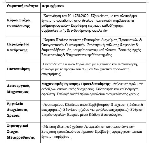 Η εκπαίδευση θα προβλέπει χάραξη στρατηγικής για την αντιμετώπιση προβλημάτων και τη διαχείριση πόρων καταξιωτική συμβουλευτική με στόχο την] ενίσχυση του βαθμού της ανθεκτικότητας των οφειλετών και εν τέλει τη διαχείριση οικονομικών και προϋπολογισμού οικογένειας και νοικοκυριού