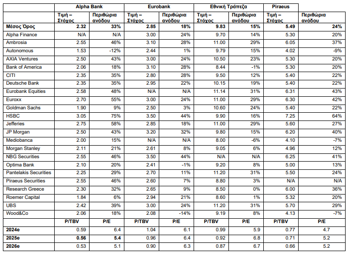 Συγκεκριμένα, οι αναλυτές θέτουν τις εξής τιμές-στόχους και αποτίμηση με βάσει τις εκτιμήσεις του 2025: