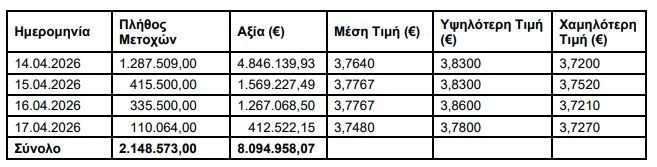 H ΑΛΦΑ ΤΡΑΠΕΖΑ (η ‘Τράπεζα’), σε συνέχεια της από 17.09.2025 ανακοίνωσής της, ενημερώνει ότι, στο Πλαίσιο του Προγράμματος Αγοράς Ιδίων Μετοχών που εγκρίθηκε με την απόφαση της Έκτακτης Γενικής Συνέλευσης των Μετόχων της με ημερομηνία 12.6.2025, κατά το διάστημα 14.04.2026 – 17.04.2026, προέβη σε αγορά μέσω του Χρηματιστηρίου Αθηνών συνολικά 2.148.573 ίδιων μετοχών, με μέση τιμή κτήσης 3,7676 € ανά μετοχή και συνολικό κόστος 8.094.958,07 €.