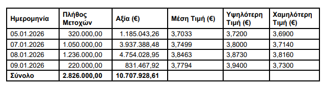 «H ΑΛΦΑ ΤΡΑΠΕΖΑ (η ‘Τράπεζα’), σε συνέχεια της από 17.09.2025 ανακοίνωσής της, ενημερώνει ότι, στο Πλαίσιο του Προγράμματος Αγοράς Ιδίων Μετοχών που εγκρίθηκε με την απόφαση της Έκτακτης Γενικής Συνέλευσης των Μετόχων της με ημερομηνία 12.6.2025, κατά το διάστημα 05.01.2026 – 09.01.2026, προέβη σε αγορά μέσω του Χρηματιστηρίου Αθηνών συνολικά 2.826.000 ίδιων μετοχών, με μέση τιμή κτήσης 3,7891€ ανά μετοχή και συνολικό κόστος 10.707.928,61€.
