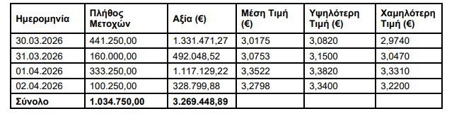 μέση τιμή κτήσης 3,1597 € ανά μετοχή και συνολικό κόστος 3.269.448,89 €.