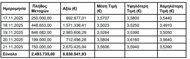 H ΑΛΦΑ ΤΡΑΠΕΖΑ (η ‘Τράπεζα’), σε συνέχεια της από 17.09.2025 ανακοίνωσής της, ενημερώνει ότι, στο Πλαίσιο του Προγράμματος Αγοράς Ιδίων Μετοχών που εγκρίθηκε με την απόφαση της Έκτακτης Γενικής Συνέλευσης των Μετόχων της με ημερομηνία 12.6.2025, κατά το διάστημα 17.11.2025 – 21.11.2025, προέβη σε αγορά μέσω του Χρηματιστηρίου Αθηνών συνολικά 2.493.735 ίδιων μετοχών, με μέση τιμή κτήσης 3,5411 € ανά μετοχή και συνολικό κόστος 8.830.541,93 €.