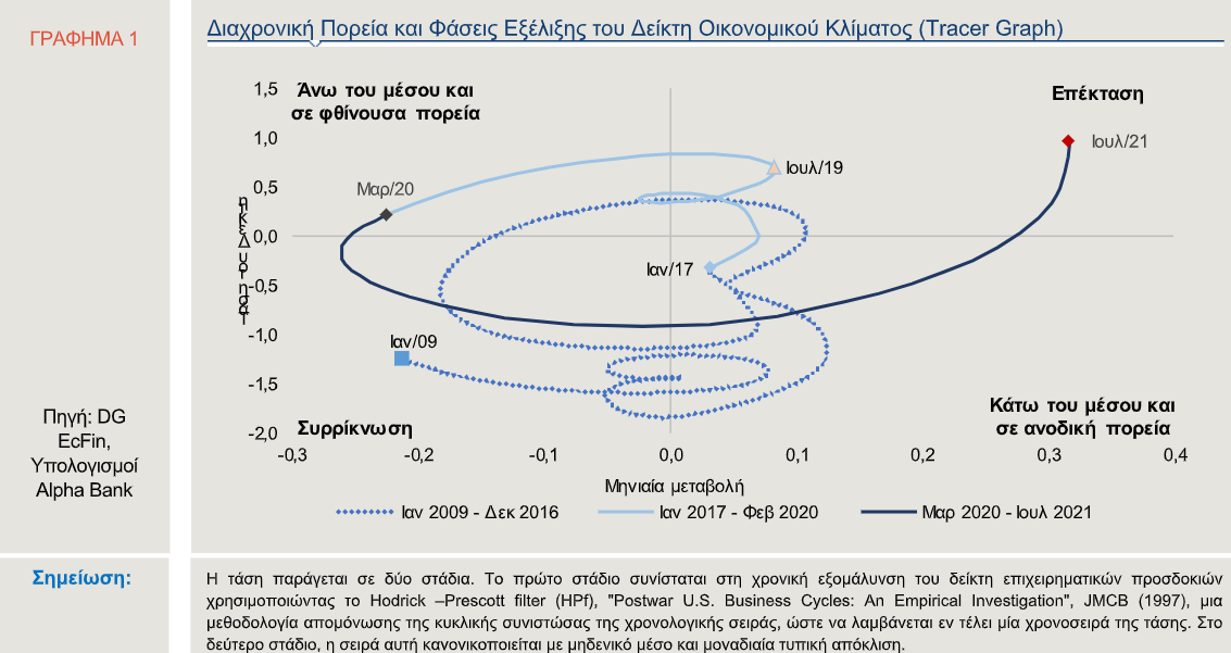 Ο Δείκτης Οικονομικού Κλίματος φαίνεται να κινείται σε επίπεδα άνω του μακροχρόνιου μέσου της τάσης, καθώς επίσης και να βρίσκεται σε ανοδική πορεία τον Ιούλιο του 2021, παραμένοντας σε φάση επέκτασης για τέταρτο συνεχόμενο μήνα, προεξοφλώντας τη σταδιακή ανάκαμψη της οικονομικής δραστηριότητας και την ανάκτηση της εμπιστοσύνης.