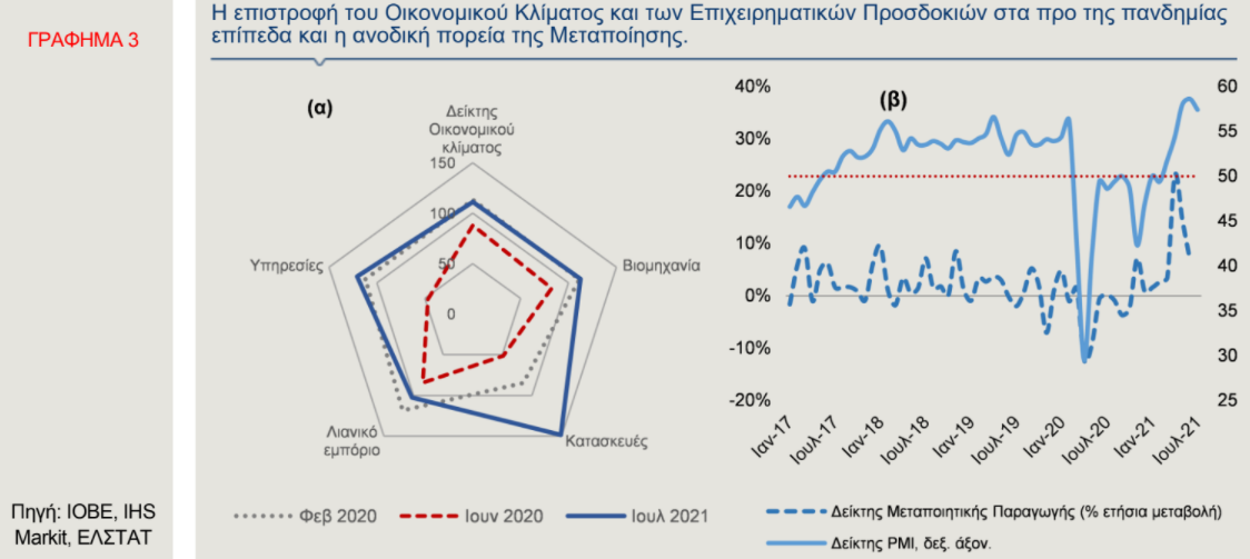 Συγκεκριμένα, στη βιομηχανία ο δείκτης επιχειρηματικών προσδοκιών ανήλθε, τον Ιούλιο του 2021, σε 112,3 μονάδες, έναντι 111,3 μονάδων, τον Φεβρουάριο του 2020 και 82,3 μονάδων, τον Ιούνιο του 2020. Ο αντίστοιχος δείκτης των υπηρεσιών υπερέβη, το φετινό Ιούλιο, την τιμή του Φεβρουαρίου του 2020 κατά 8,7 μονάδες, ενώ ο δείκτης επιχειρηματικών προσδοκιών στο λιανικό εμπόριο είχε καλύψει, τον ίδιο μήνα, περίπου κατά το ήμισυ τις απώλειες που καταγράφηκαν, στο τετράμηνο Φεβρουαρίου-Ιουνίου 2020.