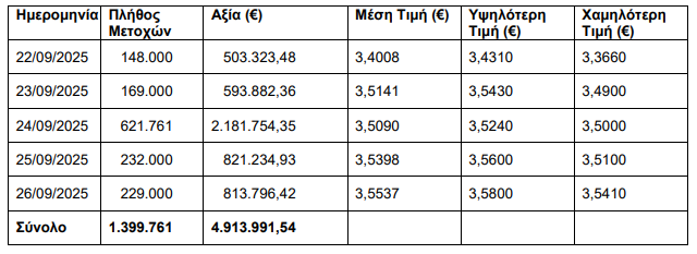 H ΑΛΦΑ ΤΡΑΠΕΖΑ (η ‘Τράπεζα’), σε συνέχεια της από 17.09.2025 ανακοίνωσής της, ενημερώνει ότι, στο Πλαίσιο του Προγράμματος Αγοράς Ιδίων Μετοχών που εγκρίθηκε με την απόφαση της Έκτακτης Γενικής Συνέλευσης των Μετόχων της με ημερομηνία 12.6.2025, κατά το διάστημα 22.09.2025 – 26.09.2025, προέβη σε αγορά μέσω του Χρηματιστηρίου Αθηνών συνολικά 1.399.761 ίδιων μετοχών, με μέση τιμή κτήσης 3,5106 € ανά μετοχή και συνολικό κόστος 4.913.991,54 €.