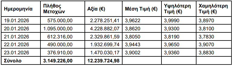 H ΑΛΦΑ ΤΡΑΠΕΖΑ (η ‘Τράπεζα’), σε συνέχεια της από 17.09.2025 ανακοίνωσής της, ενημερώνει ότι, στο Πλαίσιο του Προγράμματος Αγοράς Ιδίων Μετοχών που εγκρίθηκε με την απόφαση της Έκτακτης Γενικής Συνέλευσης των Μετόχων της με ημερομηνία 12.6.2025, κατά το διάστημα 19.01.2026 – 23.01.2026, προέβη σε αγορά μέσω του Χρηματιστηρίου Αθηνών συνολικά 3.149.226 ίδιων μετοχών, με μέση τιμή κτήσης 3,8866 € ανά μετοχή και συνολικό κόστος 12.239.724,98 €.