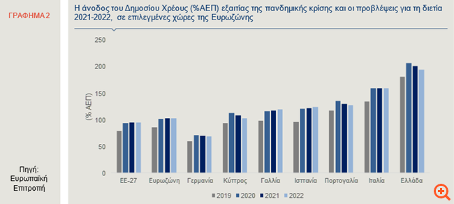 Η άνοδος των ελλειμμάτων και η παράλληλη πτώση της οικονομικής δραστηριότητας, το 2020, εξαιτίας της πανδημίας, ήταν οι κύριοι παράγοντες που οδήγησαν σε άνοδο του δημοσίου χρέους ως ποσοστό του ΑΕΠ. Αξίζει να σημειωθεί ότι, κατά μέσο όρο, στην Ευρωζώνη, ο λόγος χρέους προς ΑΕΠ αναμένεται να διαμορφωθεί σε 102%, το 2020, που αποτελεί την υψηλότερη τιμή που έχει σημειωθεί στην ιστορία της, ενώ θα σταθεροποιηθεί σε υψηλά επίπεδα, τη διετία 2021-2022. Στο ένα τρίτο περίπου των κρατών-μελών της ΕΕ-27, μεταξύ των οποίων και η Ελλάδα, εκτιμάται ότι θα σημειωθεί σταδιακή πτώση του λόγου χρέους προς ΑΕΠ μέχρι το 2022 (Γράφημα 2). Συγκεκριμένα, σύμφωνα με τις εκτιμήσεις της Ευρωπαϊκής Επιτροπής, το δημόσιο χρέος στη χώρα μας αναμένεται να αυξηθεί σε 207,1%, το 2020, από 180,5%, το 2019, ενώ προβλέπεται να μειωθεί σε 194,8% του ΑΕΠ, μέχρι το 2022 (Γράφημα 2). Στον Προϋπολογισμό 2021, προβλέπεται αύξηση του λόγου του δημοσίου χρέους προς το ΑΕΠ, το 2020, σε 208,9% και αποκλιμάκωση, το 2021, σε 199,6%.