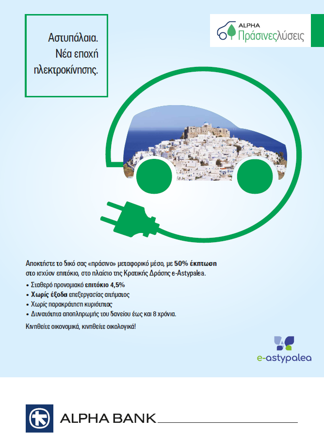 Στην Κρατική Δράση e-astypalea, που παρέχει στους μόνιμους κατοίκους του νησιού επιδότηση έως €12.000 για αγορά ηλεκτροκίνητου μεταφορικού μέσου, συμμετέχει η Alpha Bank με το Καταναλωτικό Δάνειο Alpha Πράσινες Λύσεις – Ηλεκτροκίνηση.