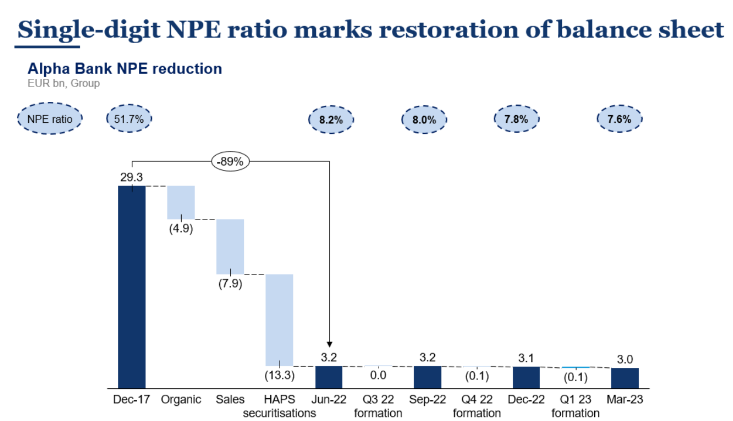 Τα αποτελέσματα του Α’ τριμήνου της Τράπεζας έδειξαν μείωση των ΜΕΑ σε σχέση με το προηγούμενο τρίμηνο κατά 23 μονάδες βάσης, με το ποσοστό ΜΕΑ να βρίσκεται στο 7,6% του δανειακού χαρτοφυλακίου και την Τράπεζα να εκτιμά ότι το ποσοστό αυτό θα υποχωρήσει περαιτέρω, κάτω του 7% για το 2023.